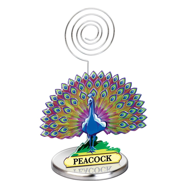 This stunning memo stand is no ordinary with its elegant and practical design. It awes you with a delicately-crafted color-brushed peacock figurine in the front that looks absolutely artistic. Topped with a coiled clip, this nickel memo stand secures cards upright for reading at a glance.