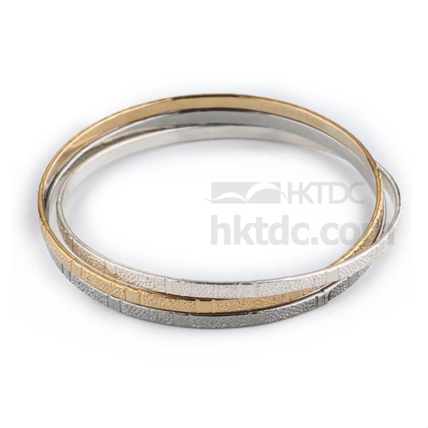 Add an elegant touch to your outfit with this set of stainless steel interlocking bangles . These bangles show off a three-toned metallic finish. It This bangle set comes in a slip-on style for easy wearing. Wear it alone or pair it with your stylish watch, this set is easy to mix and match.