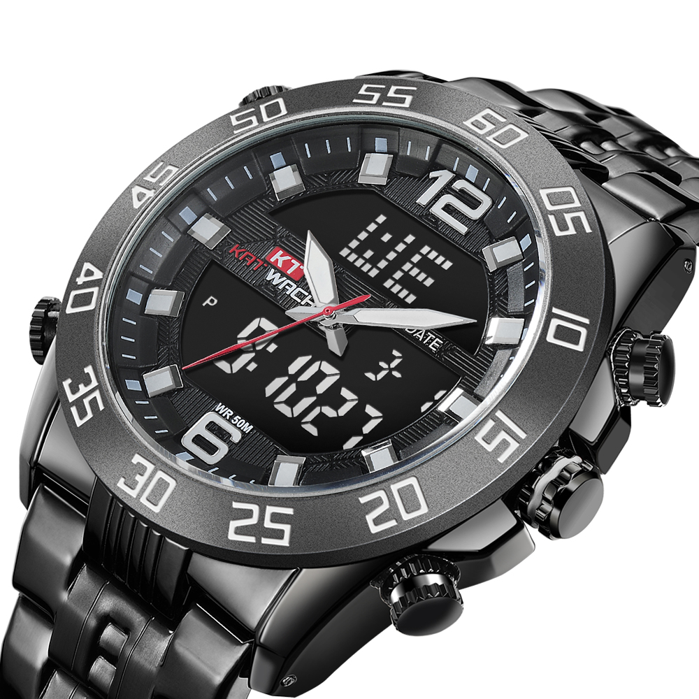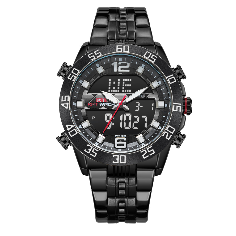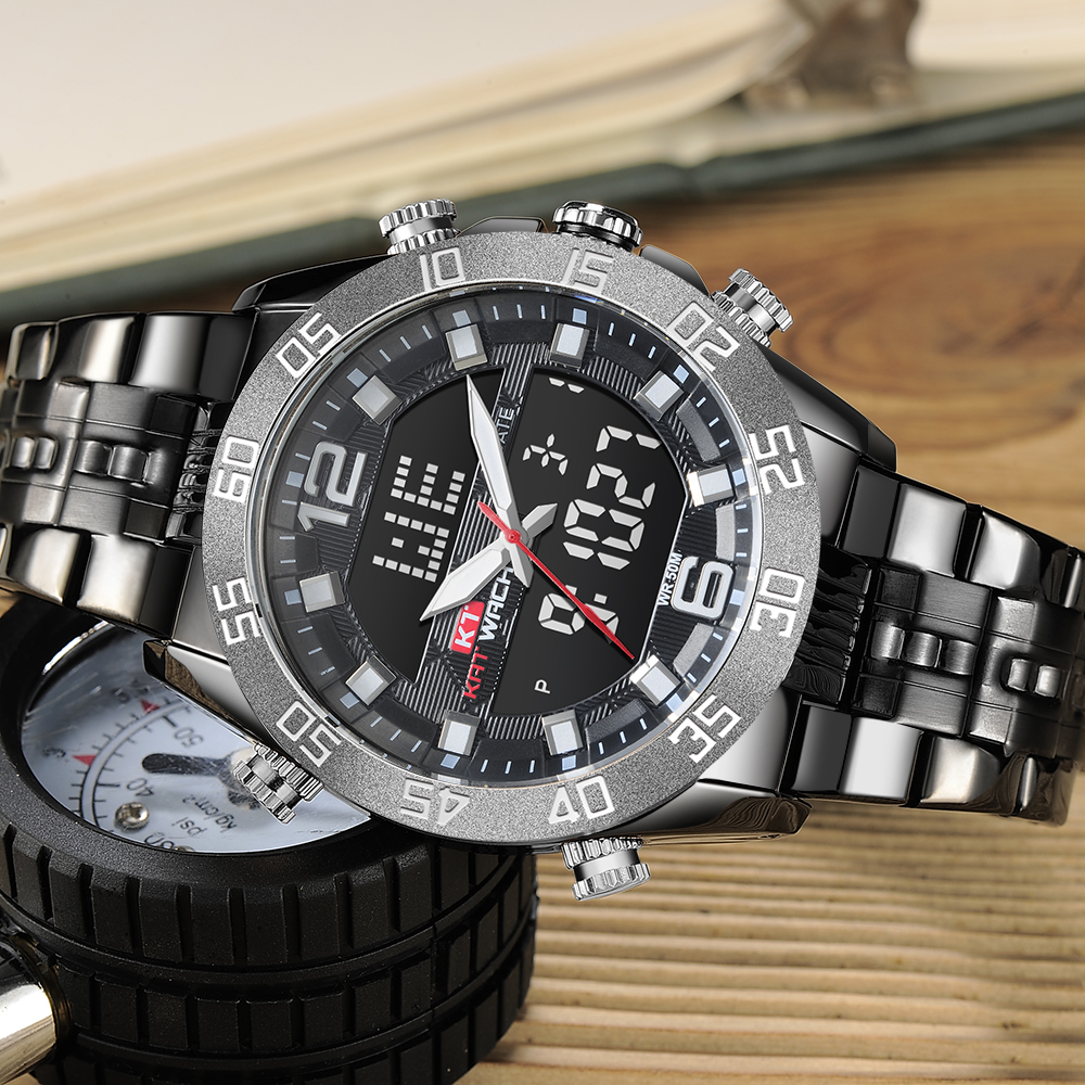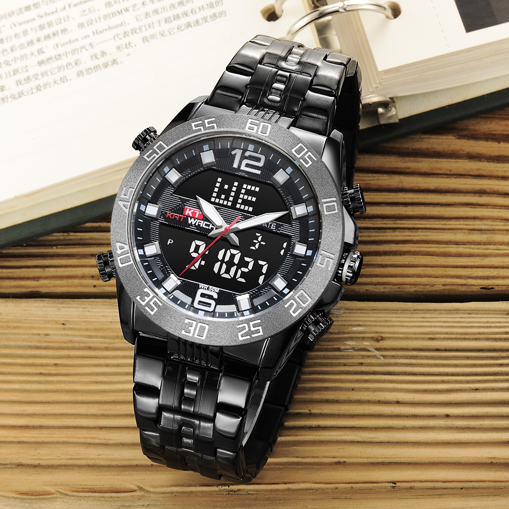 MULTIFUNCTIONAL: Both LED backlight and the traditional analog quartz movement time display of the specific design,5ATM daily life water resistance,e nable with time display ,date, day, week and alarm function.