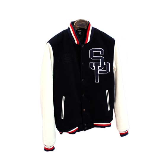 This is a men's baseball jacket that is made of high-quality wool for added comfort. It features a button-up closure, a deep-toned body and white sleeves. The white English letters on the left front and white & red details highlight this jacket with a unique touch.
