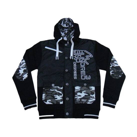 This is a black-colored hoodie designed with camouflage elbow patches and front pockets. The sweatshirt features a drawstring on the hood and a button-down design. It is cool and timeless, and looks great with a denim jacket or a suit jacket.