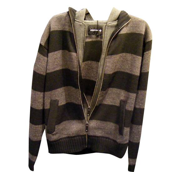 This men's cardigan is designed with brown and grey striped patterns. There are two side pockets to put wearer's personal stuff. Moreover, it has a smooth zipper closure with well knitted trim finishing.