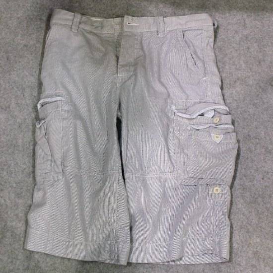 Featured is a pair of gray cargo shorts with buttoned side pockets. The plain and simple design makes them a good casual apparel for mix and match. The are a comfortable and smart choice for outdoor activities.