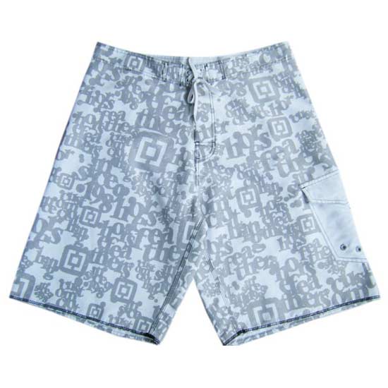 The men's board shorts feature drawstring closure with a side patch pocket. The allover alphabetical print showcases contemporary style. Hit the beach and play water sports with this fashionable pair of board shorts.