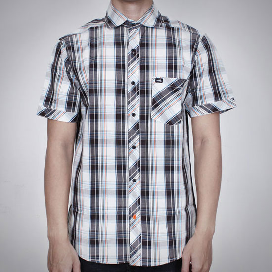This men’s short-sleeved shirt comes with a lovely checked pattern. The front is configured with a breast pocket for added functionality. The shirt features a black button closure with the lowest button in orange for a chic touch.
