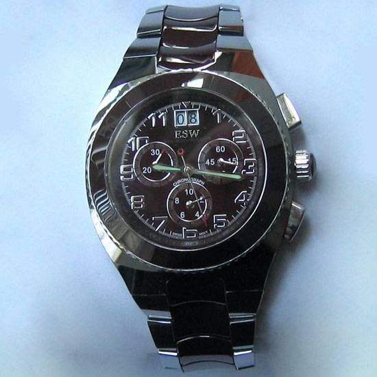 The stylish watch features a chic circular dial with three sub-dials. It comes with a tungsten case embellished with a ceramic bezel. It has a tungsten and ceramic wrist band. It features three-hand styling with big date display at the twelve o'clock position. It is an ideal piece of accessory to match with smart-casual wear.