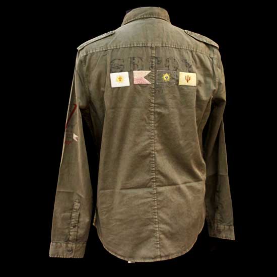 Featured here is an army green men's shirt with two chest pockets. The casual-style shirt is designed with shoulder tabs and applique logos on the back. The button-down closure finishes the style of this men's shirt.
