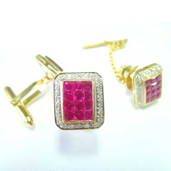 Displayed here is a pair of cufflinks that is well made of 18K gold for a refined touch. The rim of the cufflinks is embellished with well-cut diamonds. The brilliant Ruby adds a sophisticated touch to these cufflinks. This pair of cufflinks complements your stylish dress shirt nicely.