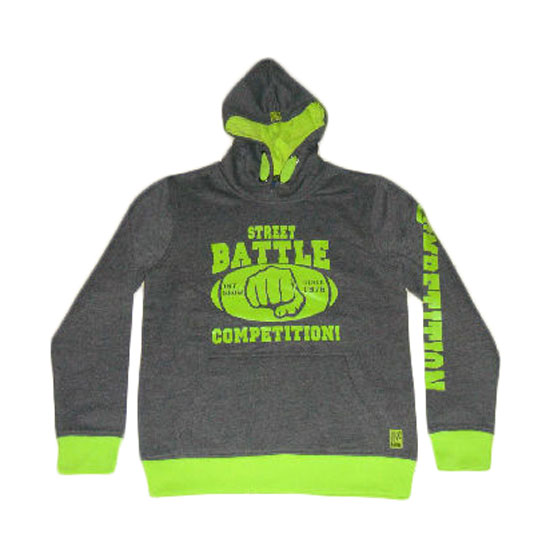This is a long-sleeve hooded fleece sweatshirt coming in a dark gray color. It is printed with contrasting green logos on the chest and green fonts on the right sleeve. It is comfortable to wear and versatile with a loose-fit cutting.