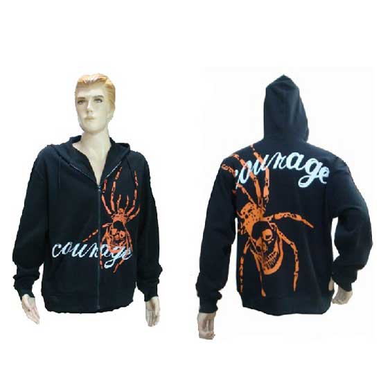 The men's jacket captures your attention with oversized orange-colored spider prints. It is also trimmed with the text "courage" in a stylish font. This piece makes an ideal complement to any casual or trendy combinations.