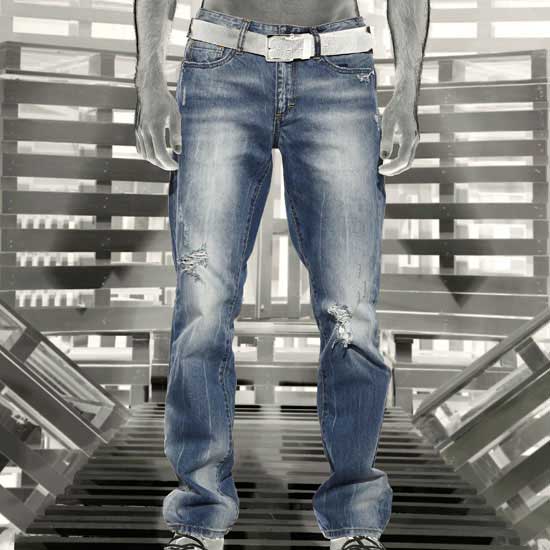 Shown here is a pair of scratched men’s jeans. Designed with washed and scratched details, these jeans allow the wearer to look stylish and youthful. A low waist construction makes these jeans comfortable and trendy.