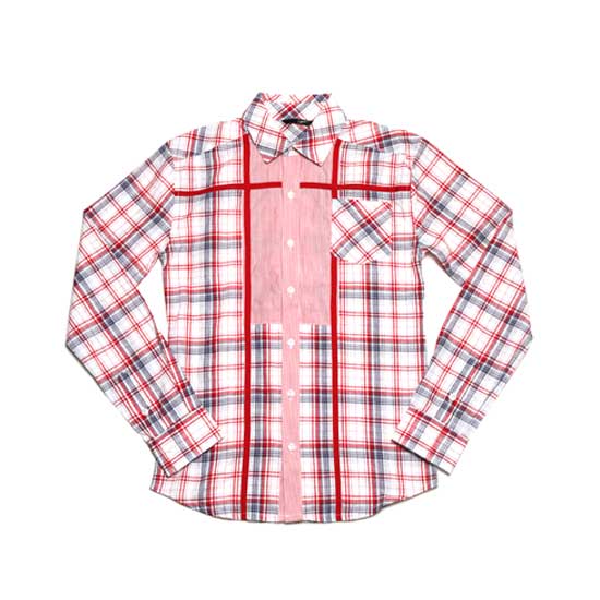 This men’s shirt features energetic check patterns in red, white and gray. The pinkish placket and red lines at front liven up the design easily. This long-sleeved shirt pairs well with a pair of jeans.