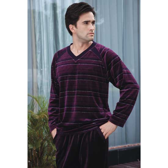 The men's night wear set includes a long-sleeve top and a pair of long pants. The top features fine multi-colored stripe patterns for added style. This night wear set offers soft and comfortable wear.