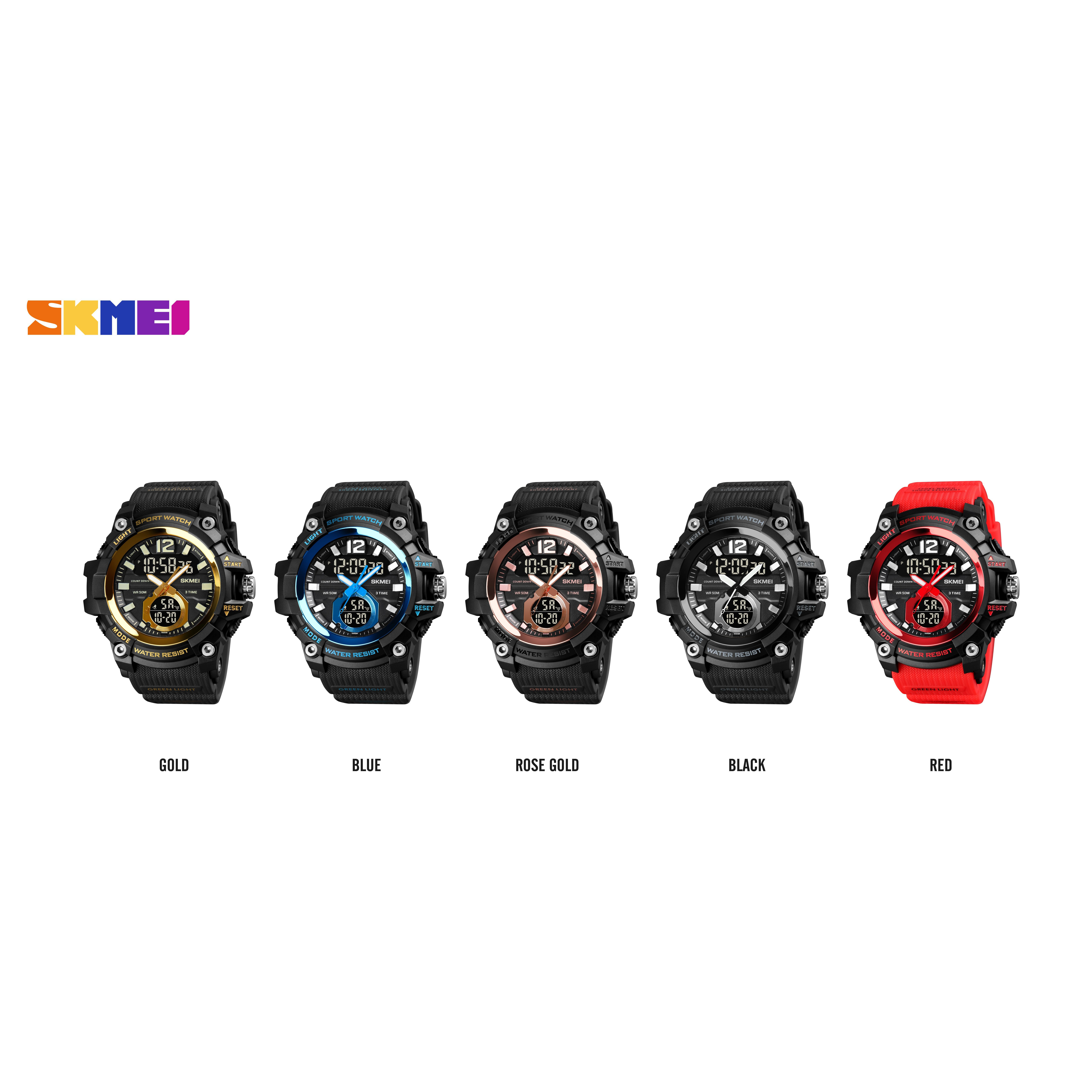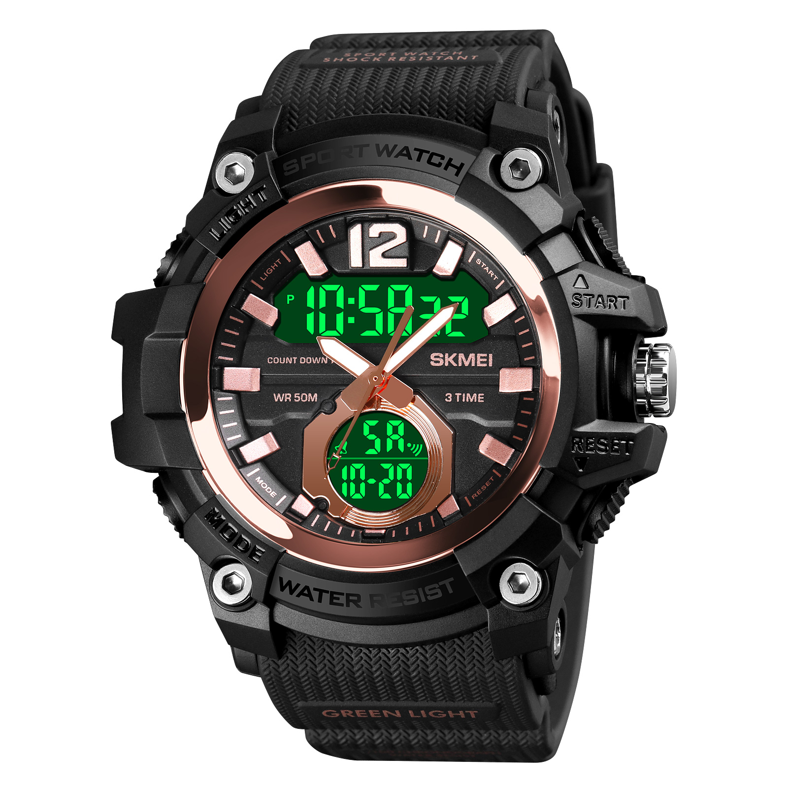 Featured here is a multi-functional men’s watch for sports and everyday wearing. It has a rugged plastic case with a plastic strap and offers both digital and analog time display. This men’s digital analog watch delivers superior precision and comes with additional functions like chrono, alarm, date, week, LED light and countdown.