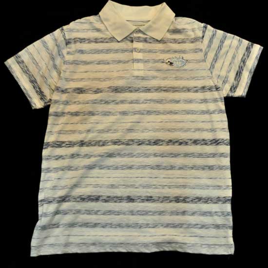 Featured is a men's polo shirt for casual wearing. The shirt boasts a stylish design with gray-and-blue striped patterns. The soft and breathable shirt offers great comfort under various conditions.