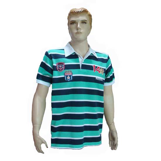 Displayed is a men's polo shirt which is weaved with pique fabric. It features a striped design and is embellished with attractive emblems. This piece offers wearers a smart character and allows them to step out with style.