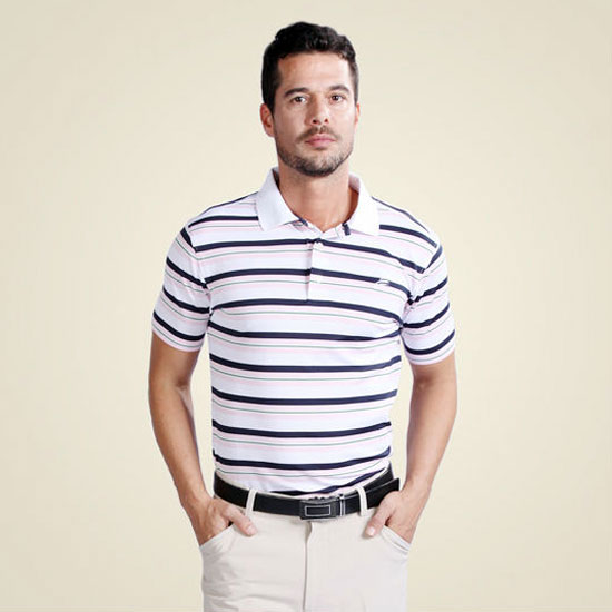 This is a men's pole shirt made of breathable, anti-UV and anti-bacterial functional fabric. It comes in white and is printed with pink, light blue and dark blue horizontal stripe patterns. This polo shirt makes a great choice for any successful gentleman.
