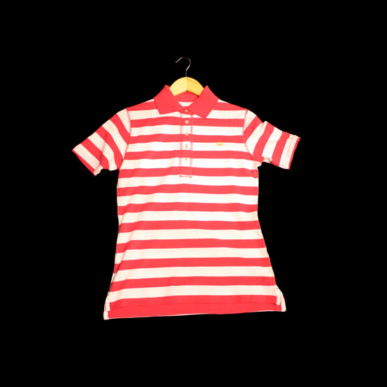 This is a men's polo shirt designed with white and red horizontal stripe patterns. It is mainly made of cotton material for a soft and comfortable texture. This polo shirt goes well with different kinds of trousers.