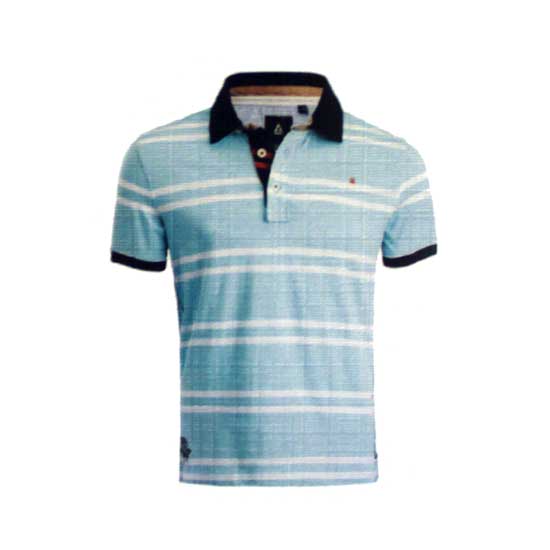 This stylish men's polo T-shirt is accented with white strip patterns on the blue background. The classic polo T-shirt features a spread collar and a two-button placket. The stylish polo T-shirt is great for assorted casual occasions.