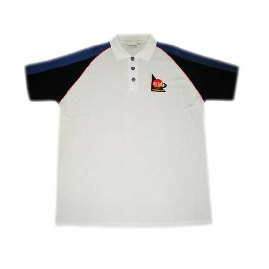 The men's polo tee showcases a construction in white and blue for a unique touch. It features a 3-button closure with a logo print on the chest. This casual-looking polo tee is an ideal outfit for recreational and sports activities.