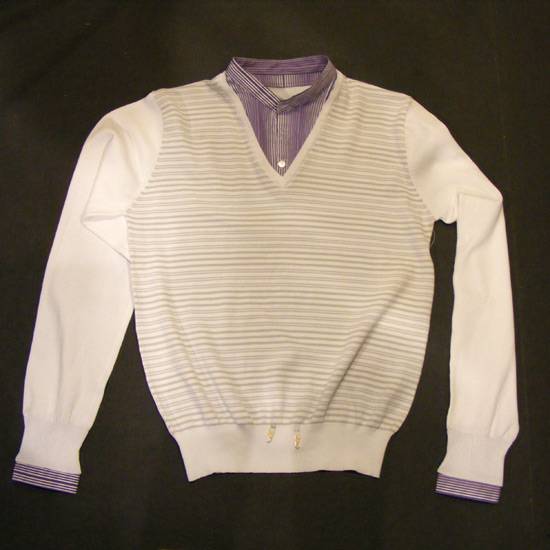 This is a men's pullover which is made of visco nylon fabric. The pullover has a V-shaped neckline, featuring a grey horizontal stripped pattern on a white background. It also has purple stripped cuffs and collar, giving a two-layered appearance.