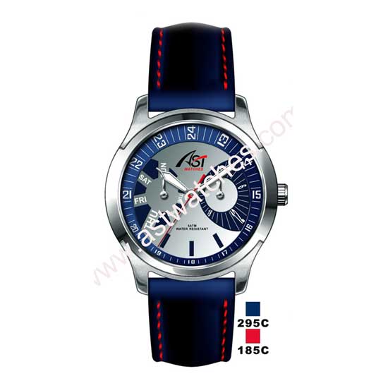 This men’s quartz analog watch features a round dial with Arabic 24-hour markers. The delicate dial is also crafted with sub-dials for showcasing the day of the week and 12-hour time. The stylish timepiece is finished with a navy blue strap with red stitched details for extra glamor.