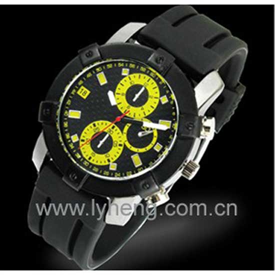 This men’s quartz analog watch features a round dial with stick minute markers for accurate time telling. The dial is artfully designed with yellow details for a sense of vogue and three sub-dials and a date display window for extra functionality. The handsome wristwatch is finished with a black silicone strap for a chic touch.