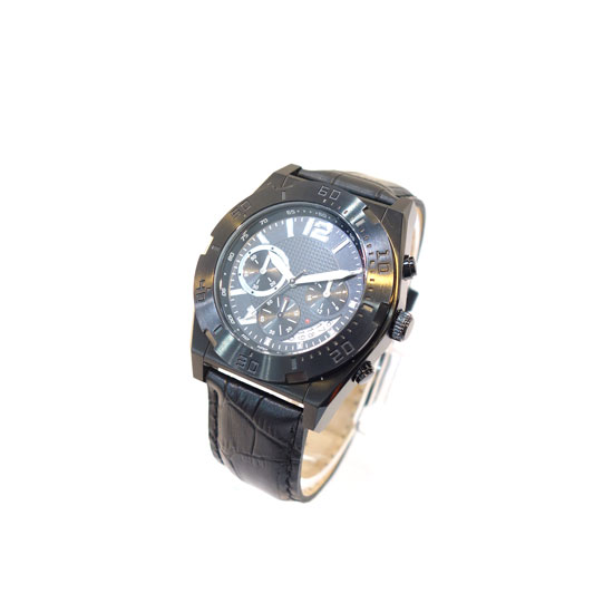 This men's quartz analogue watch comes with an all-black finish. The stainless steel bezel features engraved minute markers for a unique touch. The leather band offers superior wearing comfort for the user.