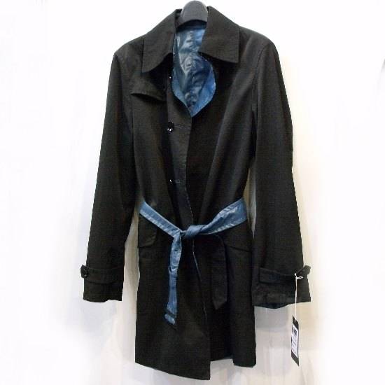 This men's raincoat features two layers in two different colors, with black on the outside and glossy blue on the inside. It features over-sized black buttons, buckled belt and cuff straps for added style. The classy design lets you stay dry in the rain with style.