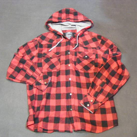 This men's shirt is designed with black and red checker patterns. It features a 5-button closure and a hood. Moreover, it has two chest pockets for holding daily accessories such as mobile phones.
