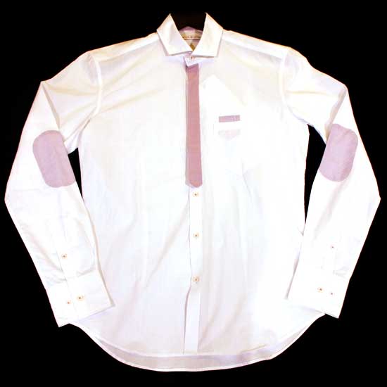 As shown is a men’s shirt coming with a slim fitted cut. The bright white shirt features striped patches on the elbows and neck. The design goes well with suits or jeans for a smart casual look.