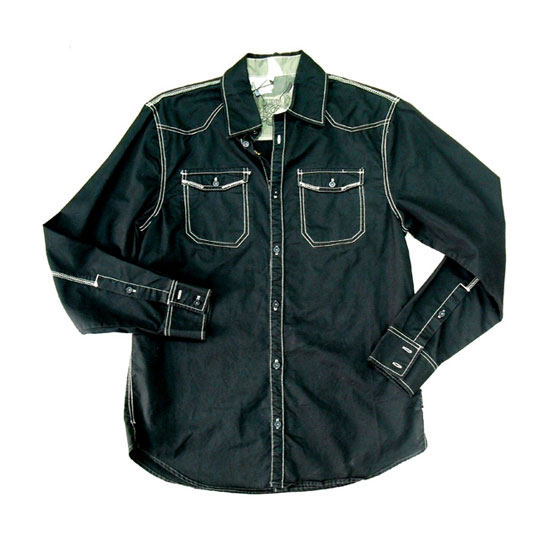 Pictured is a shirt designed to impress eyes. The white stitches on an entirely black shirt demand immediate attention. Channel your inner fashion guru with this clean and neat design.