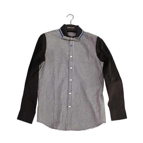 This men’s shirt features check patterns on the body and long sleeves in black. It is further complemented with a bow on the collar and round buttons in blue and white. This charming shirt is made of pure cotton.