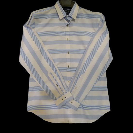 This is a men's shirt made of full cotton. It features a white background with assorted blue stripe patterns for a touch of style. This shirt is easy to mix and match with different kinds of trousers.