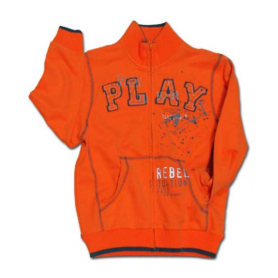 This men's sports jacket features a bright orange color with bold logos on the front. The functional jacket features a zippered front with two side-entry pockets. The soft and breathable sport jacket is perfect for wearing at all types of sports activities.