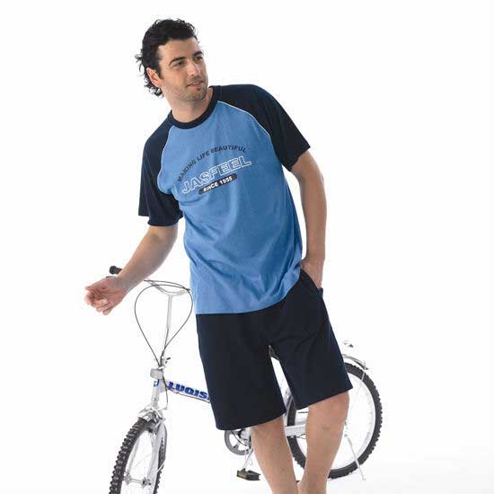 This stylish men's sportswear includes a T-shirt and a pair of sports shorts, coming in blue and black colors. The printed logo on the breast is added for a eye-catching design. The short-sleeved style maintains coolness and comfort on your body.
