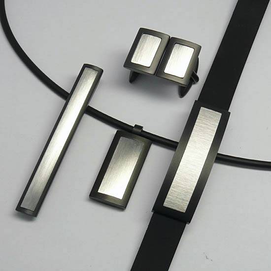 This jewelry set reflects your style with a minimal design. Each piece is adorned with a brushed stainless steel plate to showcase a sense of modesty. The subtle silver-tone sheen complements solid black trimmings in a flattering way.