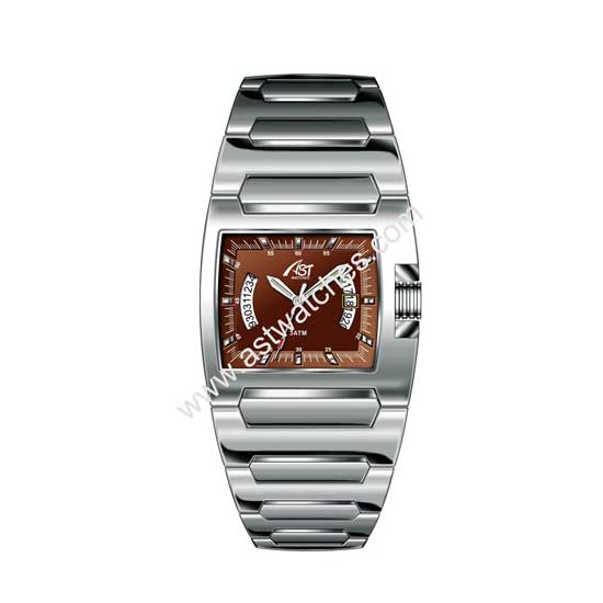 This men's quartz analog watch touts a square brown dial with stick indices. The ideal is crafted with date display windows for extra functionality. The exquisite timepiece is finished with a silvery stainless steel link bracelet.