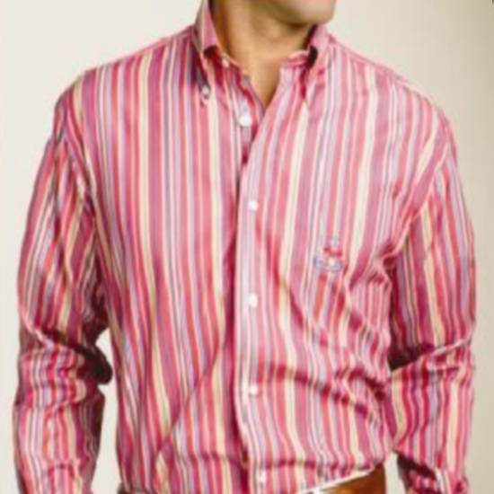 This long-sleeved woven shirt features banded cuffs, a button-down placket and collar. The classic style is embellished with an embroidered logo at the chest. The allover stripe design in soft colors is perfect for stylish gentlemen.