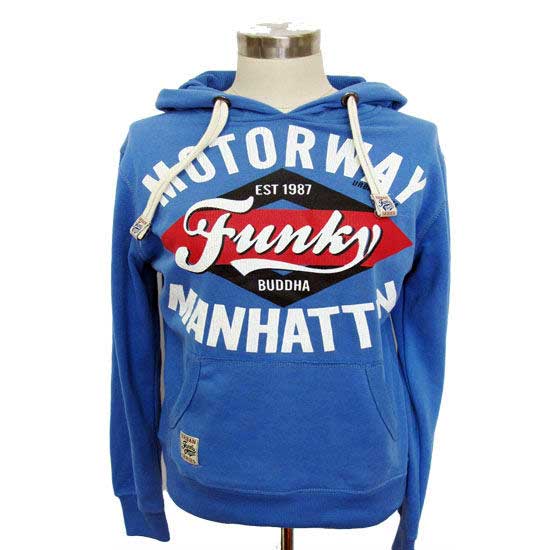 This brightly-blue men's sweat shirt is designed with beautiful logos and letters on the front. The sweat shirt features a functional hooded design with a convenient drawstring closure. The two side-entry pockets complete the design of this sweat shirt.