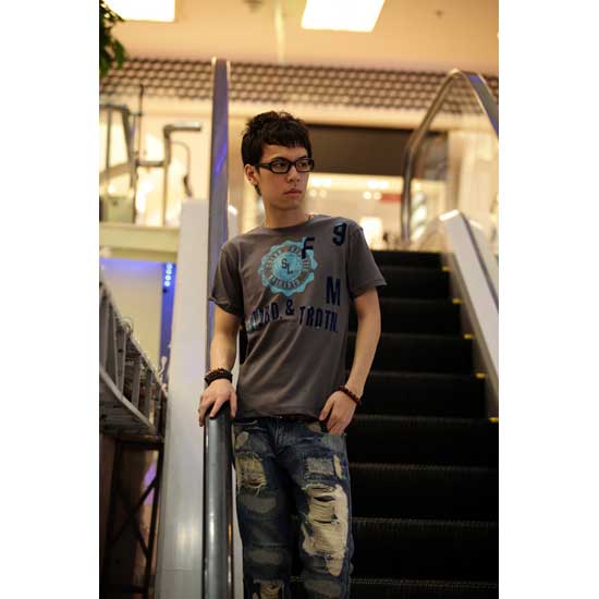 The men's cotton T-shirt goes with a round neckline and a pair of short sleeves, featuring a sky blue circular pattern with filigree and scattered prints of English characters. Keep cool and casual when you are having outdoor fun with this stylish shirt.