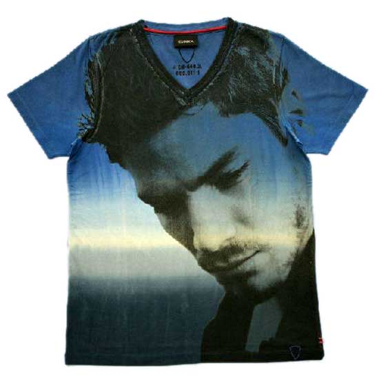 Featured here is a stylish V-neck men's T-shirt. It is designed with a large print pattern of a handsome man. The special wash effects on the garment give it an extraordinary touch.