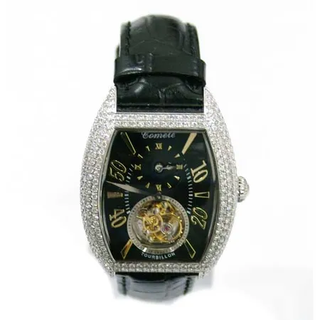 The men's mechanical watch bestows a sophisticated tourbillon movement with a skeleton dial for a glimpse of the graceful swirls and the time-keeping mechanisms inside. The tonneau case offers a touch of style to the whole piece, while the sparkling diamonds on the bezel tout glamor and elegance. With a genuine leather strap, this splendid watch makes a fashionable addition to your watch collection.