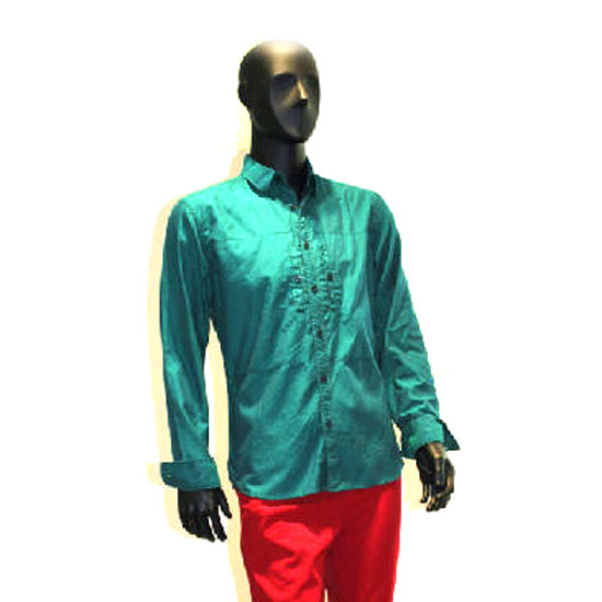 This is a men’s woven shirt with a trendy design in teal blue. It features a pointed collar, a button front closure, and long sleeves. The soft texture gives you a comfortable wearing experience.