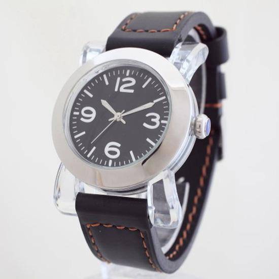 This is a round, plastic case watch with a brushed silvery finish and a classic brown dial. The brown PU strap with orange stitching adds a vintage accent to the watch. The silvery-toned hands and the pyramid markers showcase a simple and professional image.