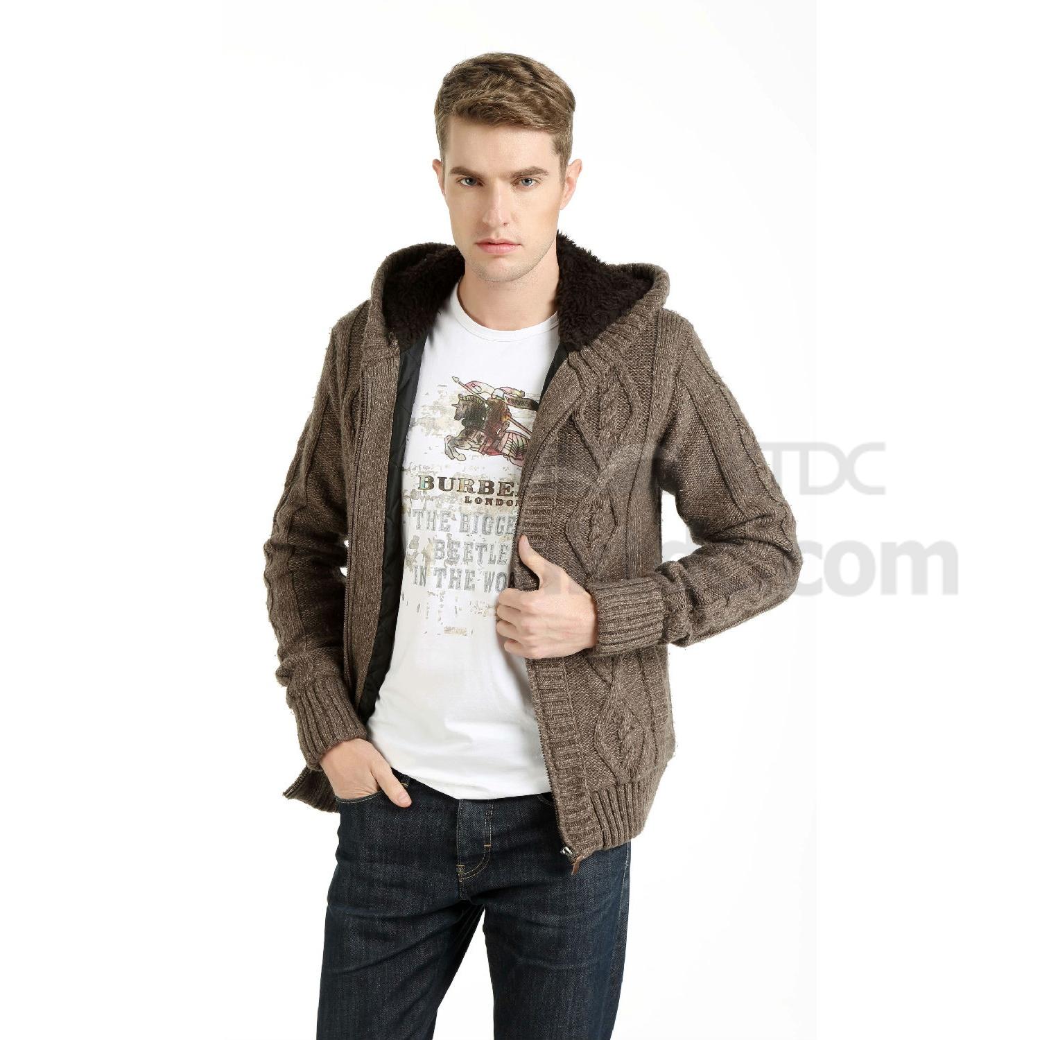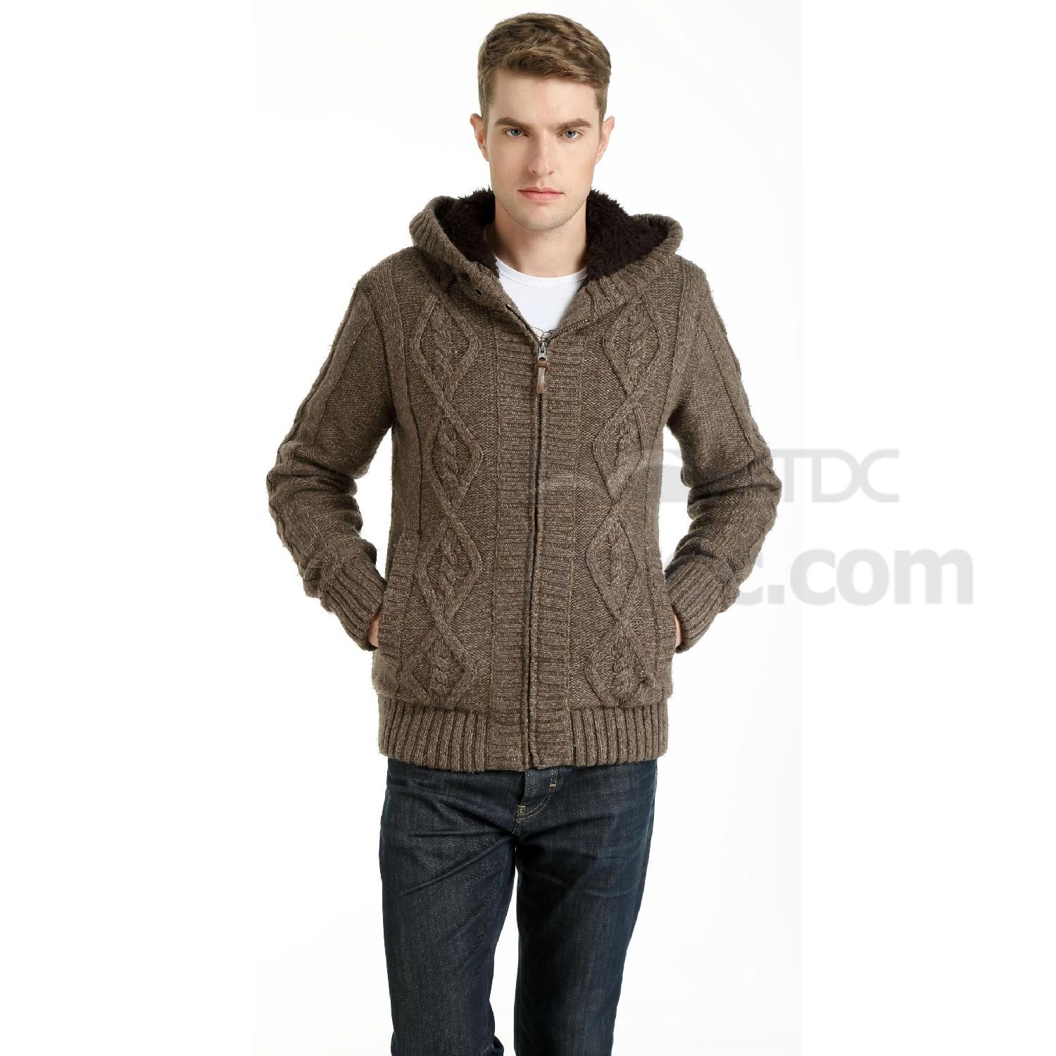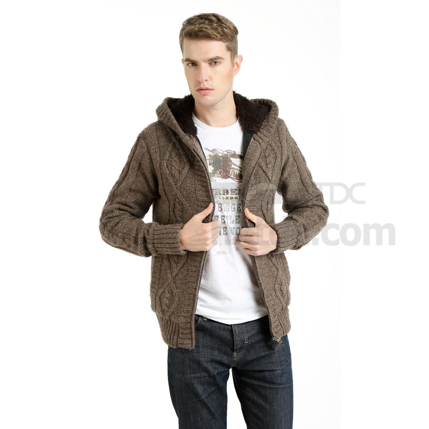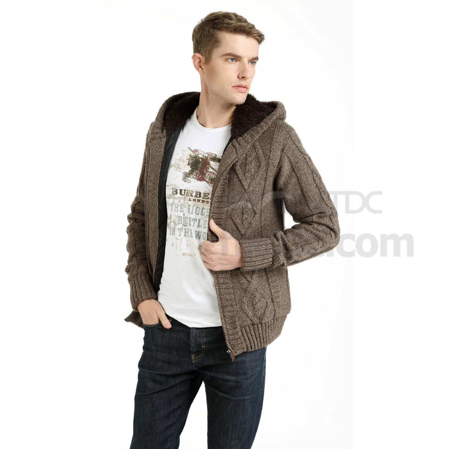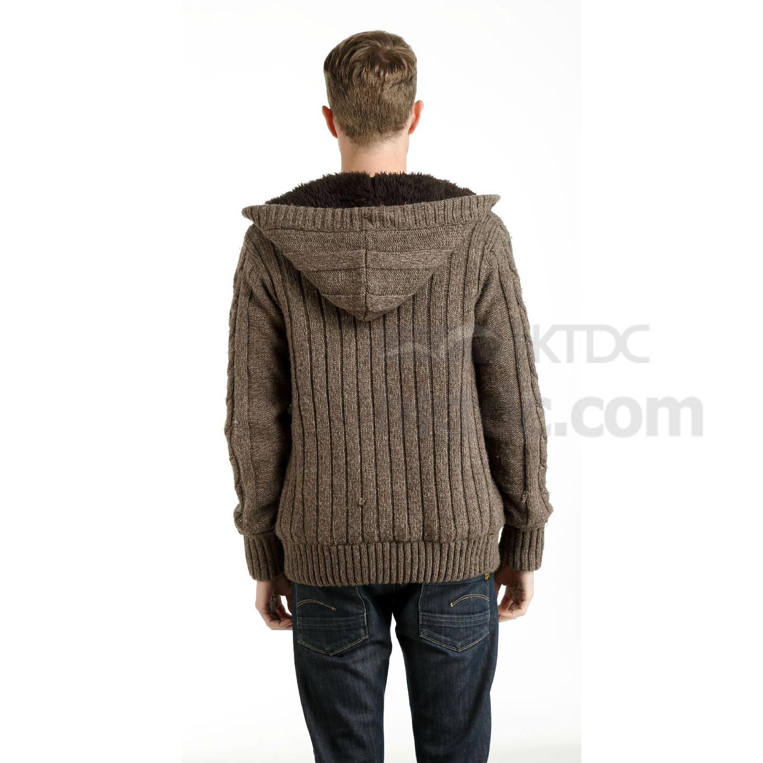 Displayed here is a men's knit jacket, fur lining create a warm and comfy felling for winter, come with knit cable pattern over front, this jacket allows easy matching and makes a great addition to your 2015 collection