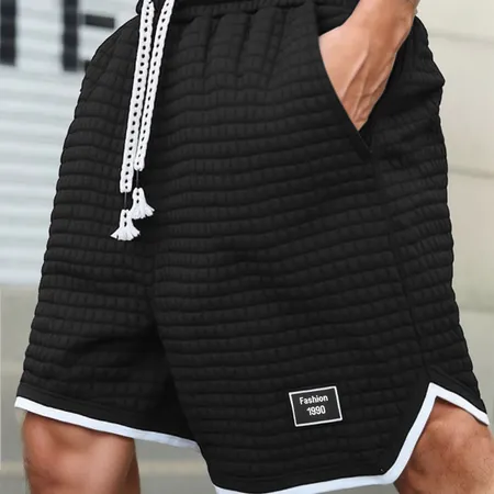 Knitted shorts with color stripes and label patterns, featuring drawstrings and pockets, classic and chic shorts