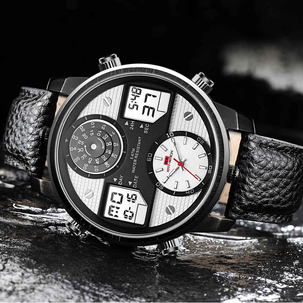 Feature: Specially two analog and one digital movements Additional back light function to show the time clearly in the darkness Four buttons and two crowns to control different functions 30 meters water resistant (Please Don't Press Any Keys Underwater)