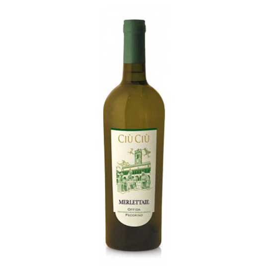 This is a bottle of Merlettaie Pecorino DOCG by Ciu Ciu. With a vintage year of 2011, this white wine has a light straw color and fruity notes. This delicious table wine is great for accompanying seafood dishes.