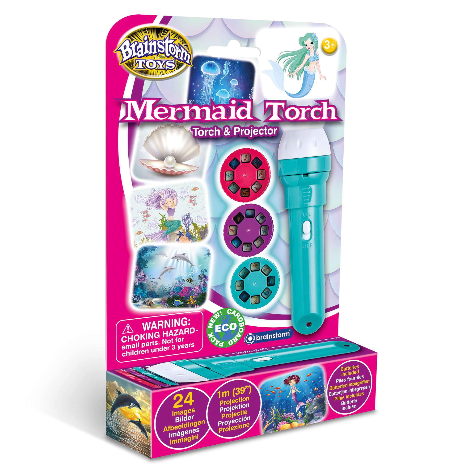 The torch comes with three slide discs with 24 colour mermaid images. Swap and change the slides easily by pulling back the plastic flap and inserting the chosen disc then rotate the disc round to view the fantastic colour images which project up to one metre wide. Images are easily focused by turning the lens head. This product can be used as a normal torch without the slides in place and is great for keeping on bedside tables to give comfort to children during the night. The torch measures 11cm long and approximately 3.5cm in diameter at the widest point.